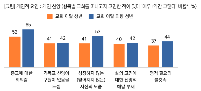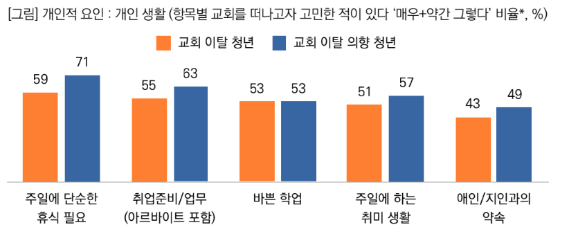 교회를 떠난 개인적 이유에 대해서는 ‘주일에 휴식이 필요해서’가 공통적으로 가장 많이 꼽혔으며, 이 외에도 취업 준비, 학업, 취미생활 등이 주요 사유로 나타났다. 종교적 회의감도 주요 이탈 동기로 지목됐다. ‘헌신 요구’와 관련해서는 이탈 의향 청년의 절반 이상이 ‘지나친 헌신’이나 ‘헌금 강요’를 부담스러워한다고 응답했다.