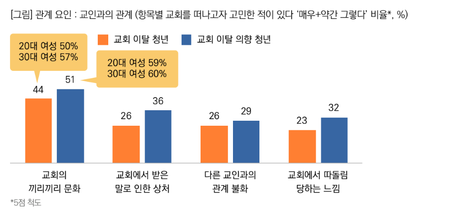 또한 교인 간의 관계에 있어서는 ‘끼리끼리 문화’가 가장 큰 소외 요인으로 지목됐다. 특히 2030 여성 청년의 경우 이에 대한 민감도가 높았다. 연구소는 “청년부 내부의 폐쇄적인 분위기가 소속감을 저해하고, 결국 이탈로 이어질 수 있다”고 경고했다.