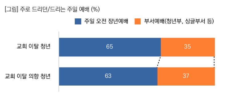 조사 결과 이탈 의향이 있는 청년의 63%가 주일에 장년예배만 드리는 것으로 나타났다. 과거 교회를 떠난 청년 역시 65%가 장년예배를 드렸다고 응답했다. 연구소는 “장년예배 속에 숨어 있는 청년들을 청년 공동체로 이끄는 전략이 필요하다”고 제언했다.