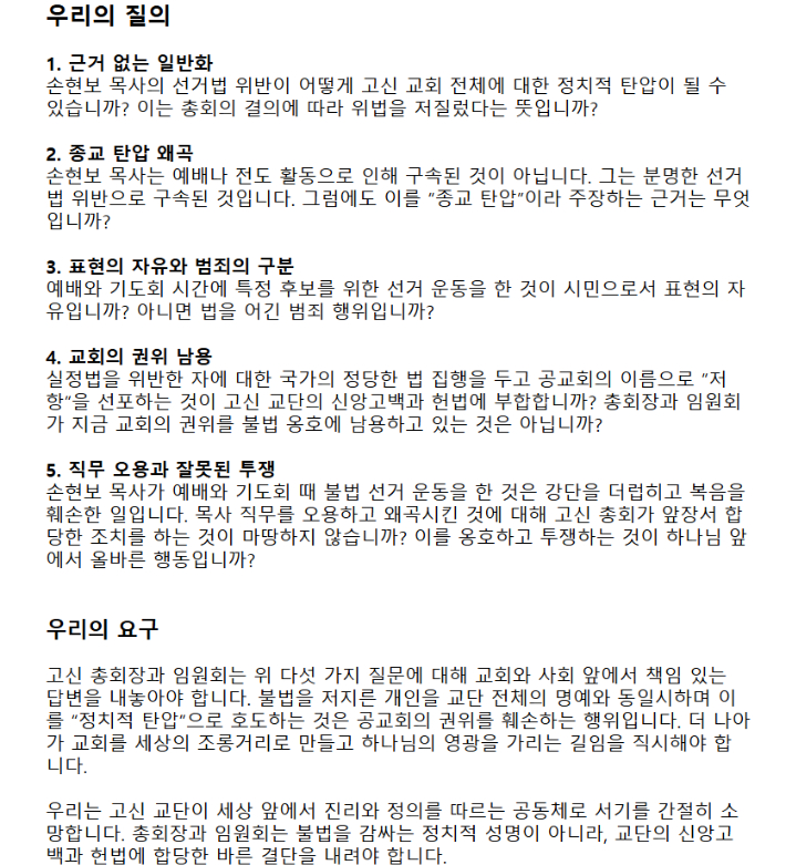 '고신을 사랑하는 성도들의 모임'은 '고신 총회장과 임원회에 드리는 공개 질의'를 발표하고 "손현보 목사의 선거법 위반이 어떻게 고신 교회 전체에 대한 정치적 탄압이 될 수 있느냐면서 예배나 전도 활동이 아닌 선거법 위반으로 구속된 게 어떻게 '종교 탄압'인지" 등을 따져 물었습니다.