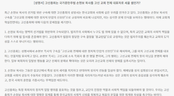 또 고신 총회의 성명에 대해 "고신 교단의 신앙과 공교회의 권위를 크게 훼손하는 처사"라고 비판하면서 "불법을 감싸는 정치적 성명이 아니라, 교단의 신앙고백과 헌법에 합당한 바른 결단을 내려야 한다"고 촉구했습니다.
